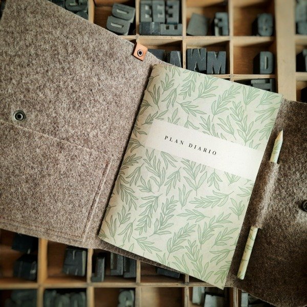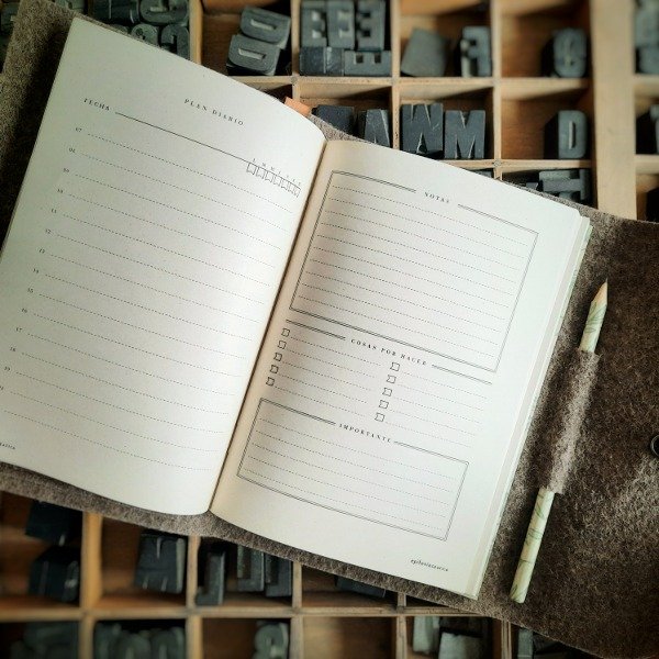 Contiene 40 hojas para planear el día y 40 hojas lisas cosidas a mano, cierre con broche de metal, lápiz negro, bolsillo interno y detalle en cuero.