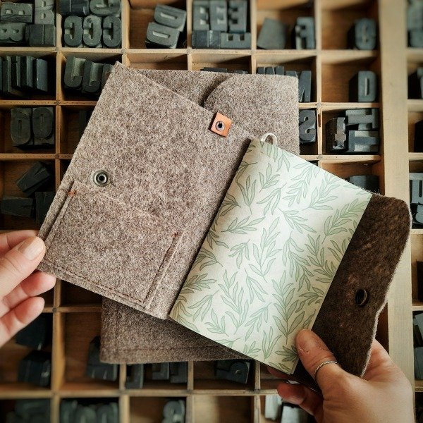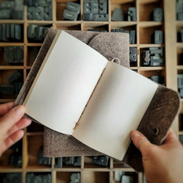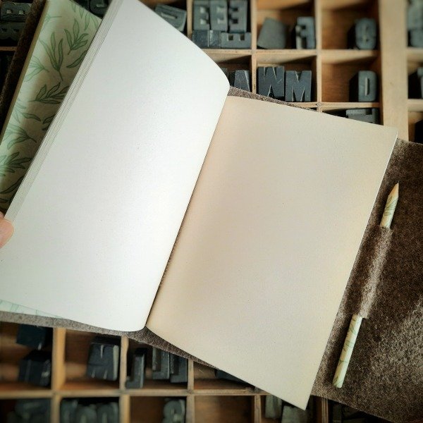 Contiene 40 hojas lisas cosidas a mano, cierre con broche de metal, bolsillo interno y detalle en cuero.