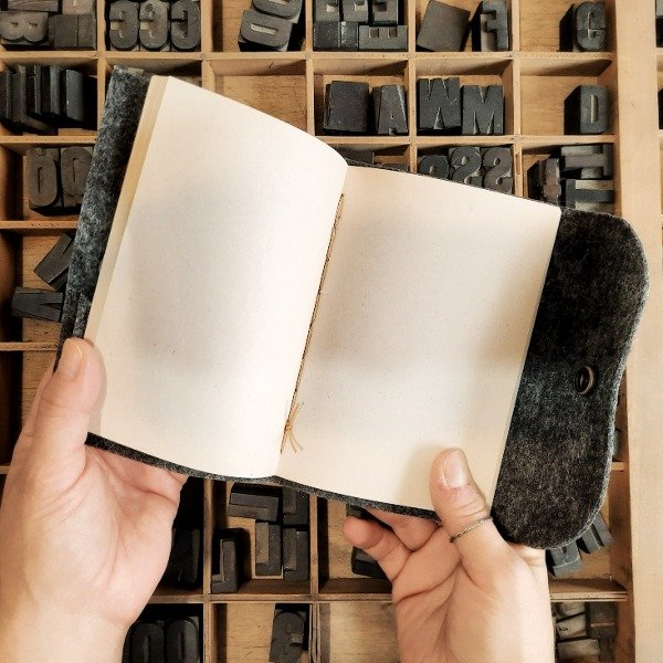 Contiene 40 hojas lisas cosidas a mano, cierre con broche de metal, bolsillo interno y detalle en cuero.
